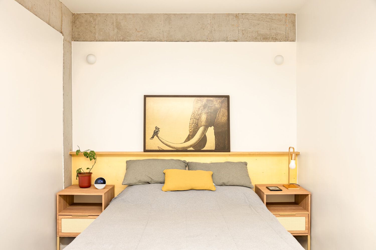 La estructura original del apartamento fue despojada para revelar el concreto expuesto, que se convirtió en un elemento central del diseño, influyendo en la selección de acabados, texturas y colores a lo largo de todo el proyecto. El suelo se cubrió con microcemento, creando una superficie neutral y continua que unifica los espacios y mejora visualmente la sensación de amplitud.