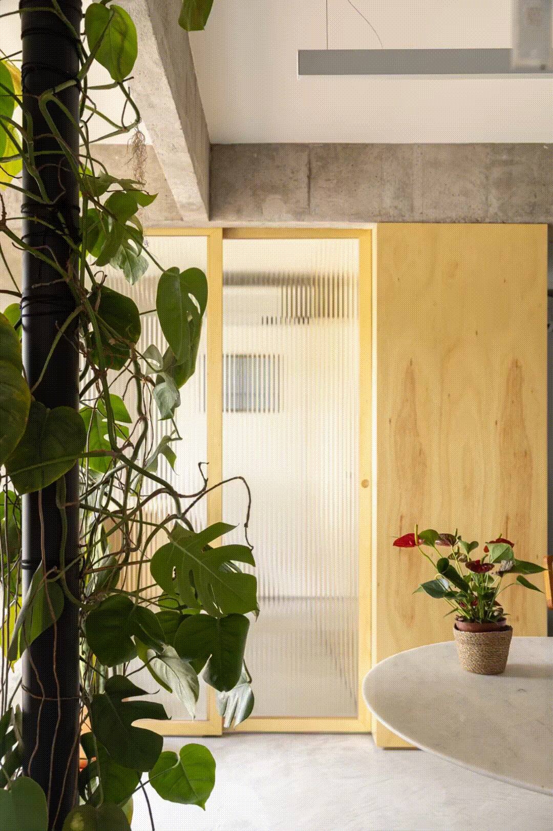 La renovación integró completamente los espacios del apartamento, con armarios de contrachapado sirviendo como elemento central para organizar y separar áreas, además de ofrecer almacenamiento y funcionalidad. Las puertas corredizas de madera y vidrio estriado proporcionan separación entre la sala de estar y la oficina, así como entre la cocina y la lavandería, permitiendo divisiones espaciales sin disminuir la luz natural ni la sensación de apertura.