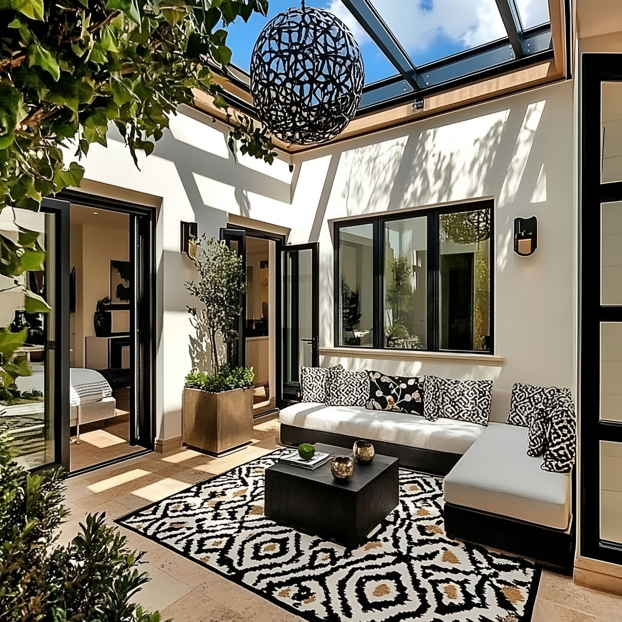 - Conjuntos de Comedor para Exterior: Si el atrio está diseñado como un espacio de vida al aire libre, un conjunto de comedor para exterior puede ser una adición práctica, incluyendo una mesa y sillas fabricadas con materiales resistentes.