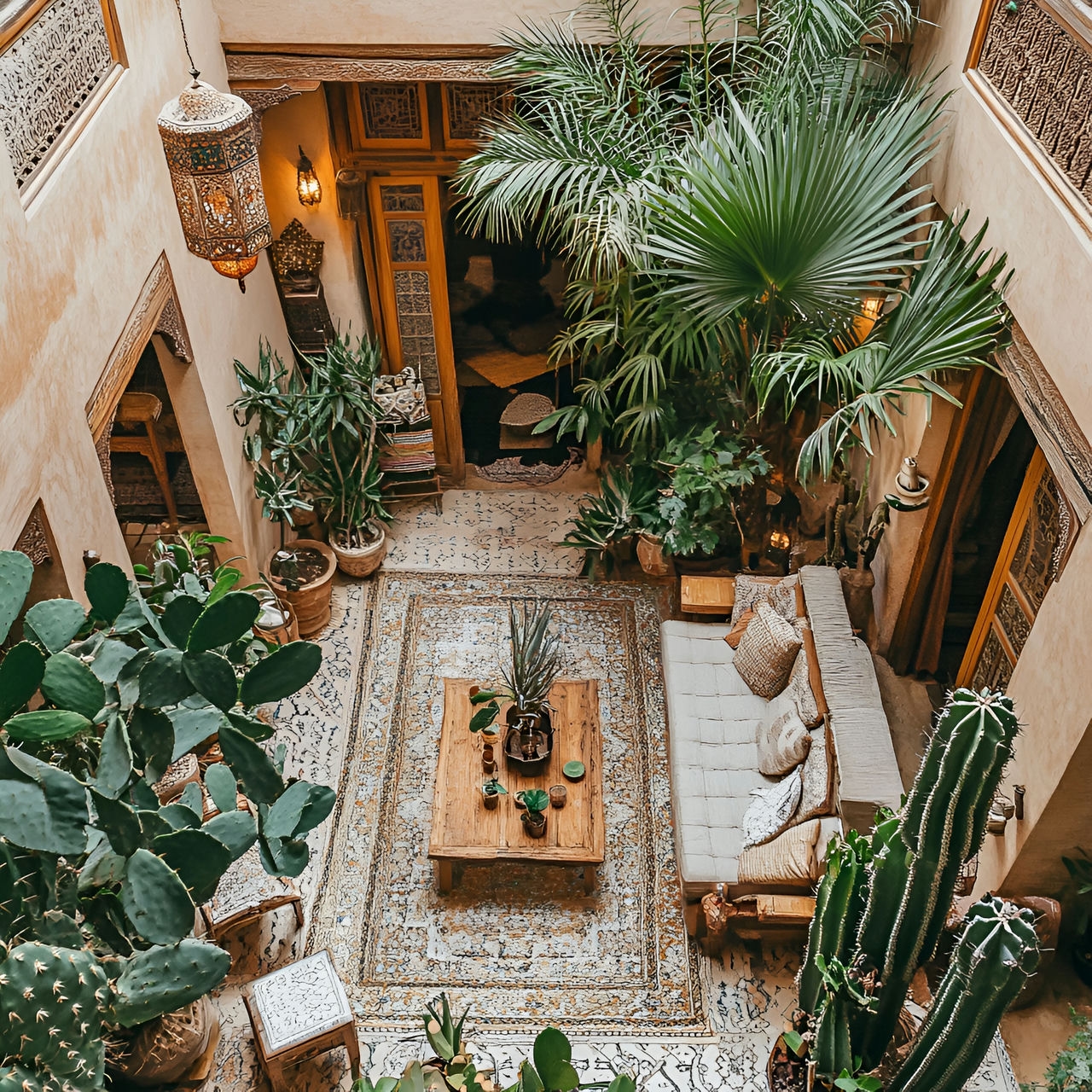 - Terracota: Un color clásico para atrios, aporta una estética cálida y orgánica. Funciona especialmente bien en espacios con plantas y muebles de madera o hierro forjado.