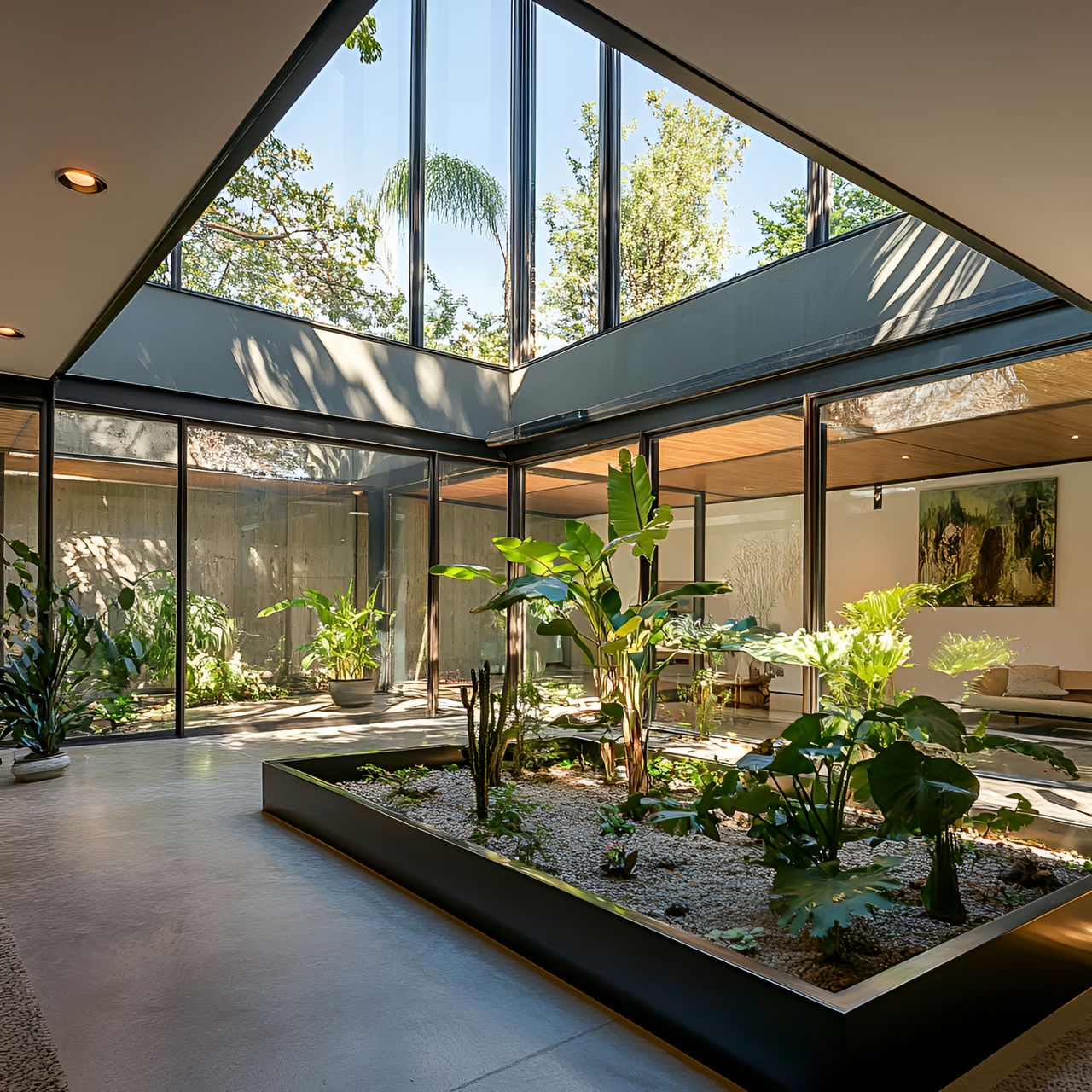 Un atrio residencial típico varía entre 4 metros cuadrados (45 pies cuadrados) y 8 metros cuadrados (90 pies cuadrados). Este tamaño permite un área de descanso modesta con vista a un pequeño jardín o una fuente de agua. Una altura estándar de techo de 2,4 metros (8 pies) o hasta 3 metros (10 pies) funciona bien. Esta distribución ofrece un espacio íntimo para que una o dos personas disfruten de la luz natural y el aire circulante en el hogar. El tamaño promedio de un atrio es de entre 8 metros cuadrados (90 pies cuadrados) y 12 metros cuadrados (130 pies cuadrados), permitiendo una mejor integración del mobiliario. La altura del techo varía de 3 metros (10 pies) a 4,5 metros (15 pies), y los atrios de tamaño estándar incluyen elementos como fuentes estrechas o macetas en la base de las paredes. Un banco delgado, una mesa y algunas sillas cercanas permiten que de 3 a 4 personas se relajen en este espacio lleno de luz. Los atrios de lujo en grandes propiedades superan los 20 metros cuadrados (215 pies cuadrados) y, en muchos casos, alcanzan más de 40 metros cuadrados (430+ pies cuadrados). Tragaluces personalizados y sistemas de techos de vidrio permiten que la luz fluya a través de la amplia habitación. Estas distribuciones incluyen amplios elementos acuáticos, chimeneas, múltiples áreas de descanso y paisajismo especializado tanto en orientación horizontal como vertical.