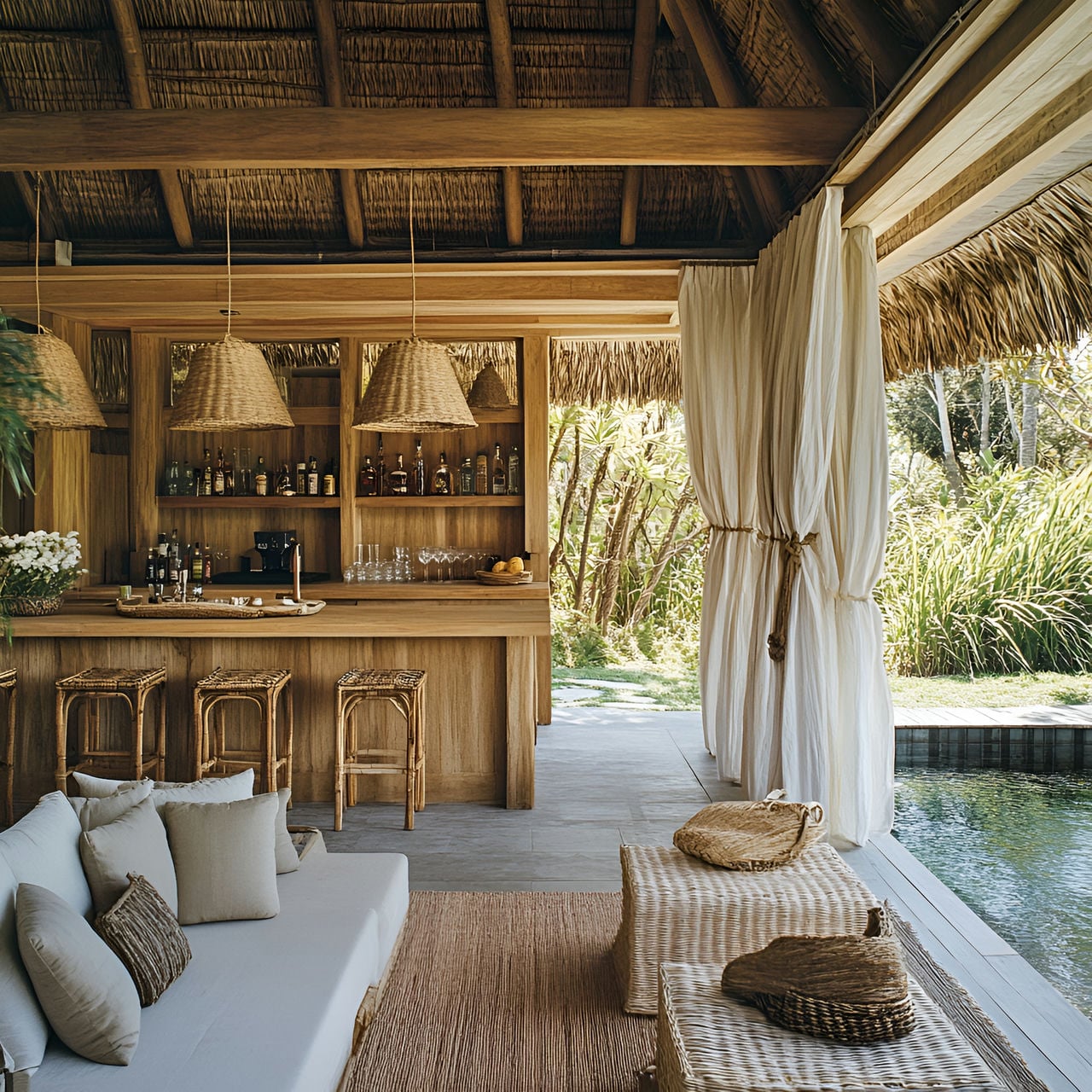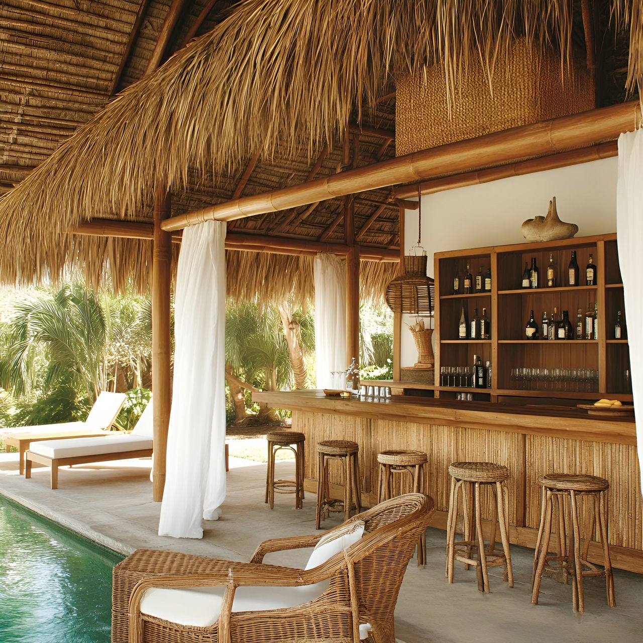 - Taburetes de bar y barra: Algunas casas de piscina cuentan con una pequeña zona de bar con taburetes, ideal para servir bebidas o disfrutar de aperitivos junto a la piscina.