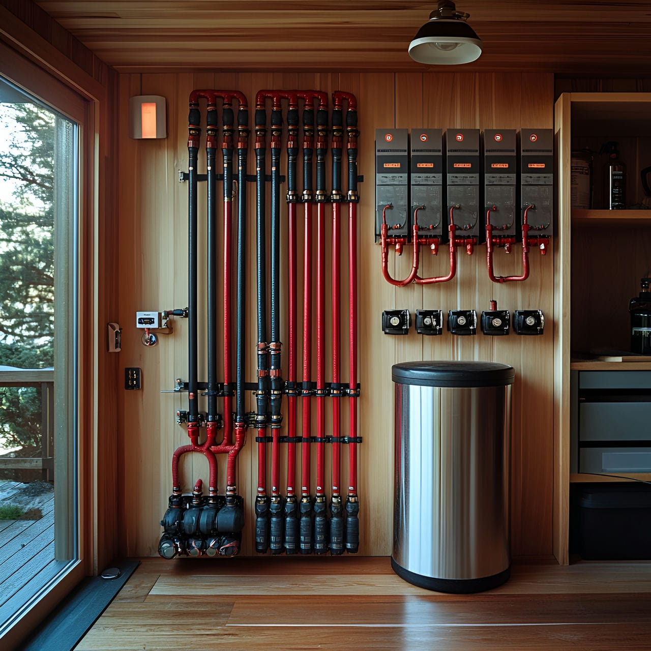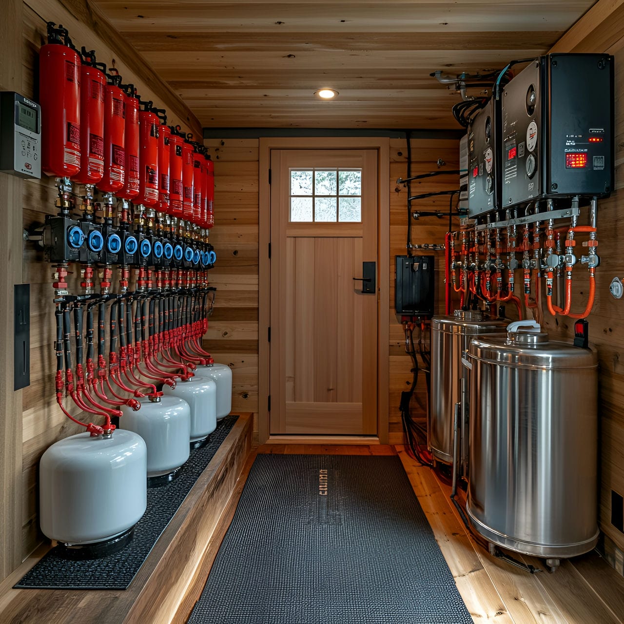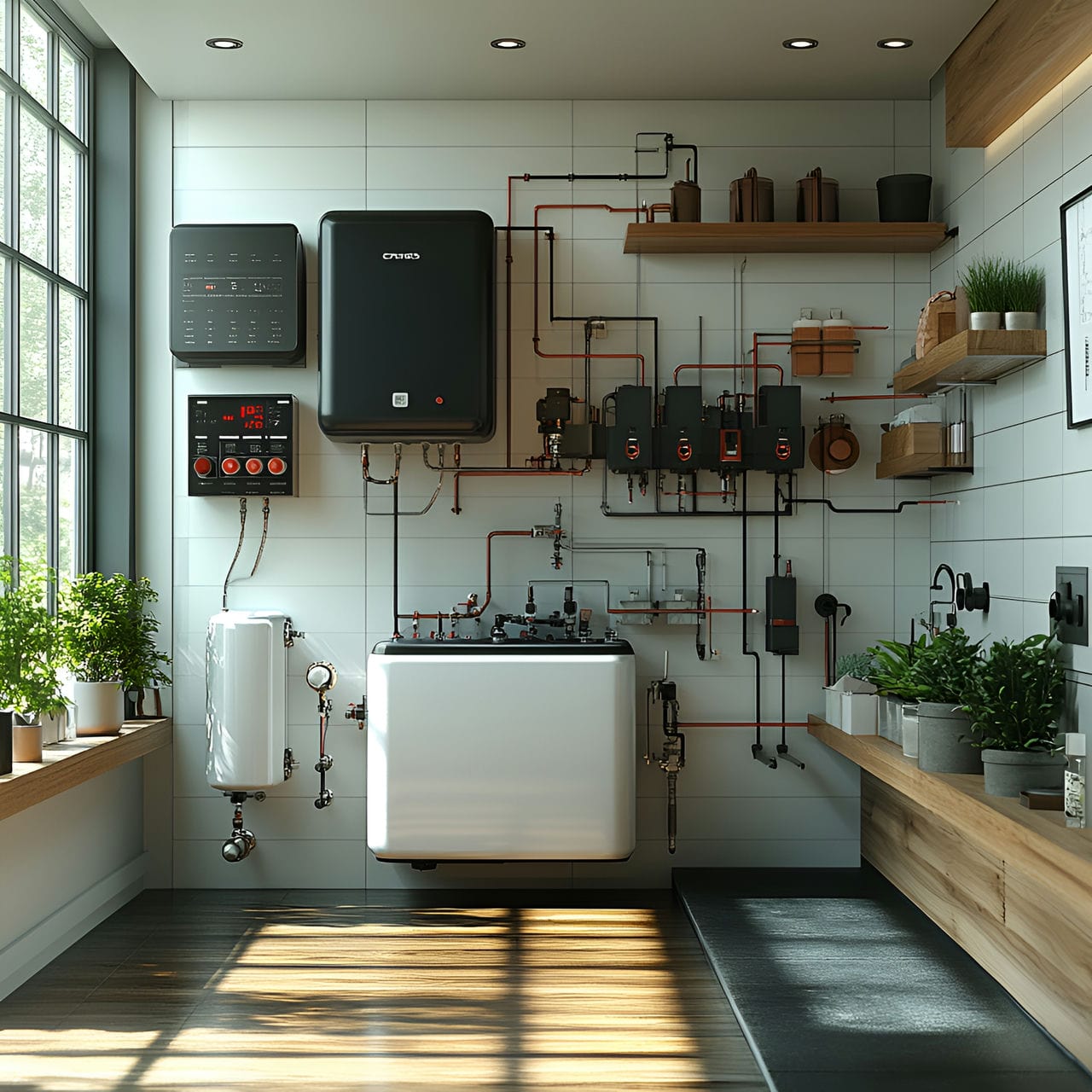 La puerta de acceso se sitúa generalmente en uno de los extremos para facilitar el mantenimiento o las intervenciones de emergencia, mientras que el lado opuesto alberga las salidas de gases y los sistemas de ventilación exigidos por la normativa, con separaciones mínimas de aproximadamente 1 pie (0,3 metros). Las dimensiones de los lados cortos maximizan las conexiones de infraestructuras exteriores a través de muros de hormigón, enlazando las instalaciones de gas, electricidad y fontanería que dan servicio a la propiedad. Las salas de calderas contemporáneas con sistemas de alta eficiencia incorporan automatización informática avanzada, lo que permite la supervisión remota de los equipos mediante dispositivos móviles.